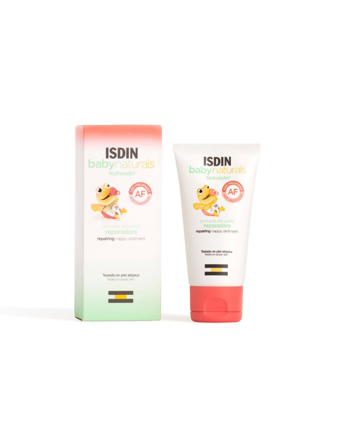 Isdin Nutraisdin AF Repairing Ointment is an ointment that helps repair and soothe the skin in the nappy area. With antifungal action (miconazole), it helps prevent the proliferation of infectious agents and repairs the skin of baby's bum. Can be used after every nappy change. Soothes the skin, repairs and minimises redness. Insulates and leaves a protective film on the skin, while soothing and relieving between changes. Suitable for situations of infection, redness and irritation (nappy rash). Repairs and soothes fragile skin while protecting it from the aggressions caused by contact with urine, faeces and nappy friction. Can be used from 0 months. Paediatric and dermatologically tested. For all skin types, including atopic.