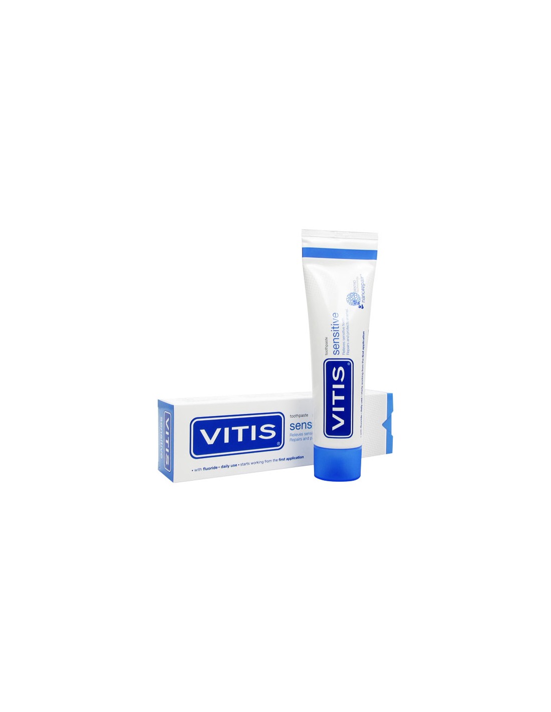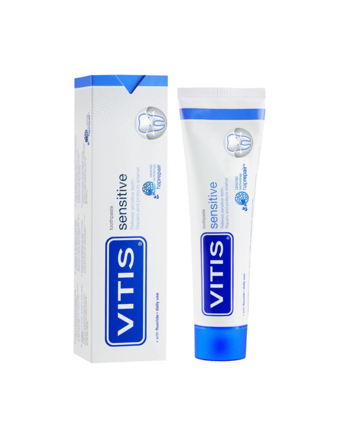 Vitis Sensitive Toothpaste is a toothpaste recommended for the daily oral hygiene of adults and children over 7 years old, in case of sensitive teeth. Protects the gums, repairs, and strengthens enamel. Cleans, relieves, repairs, and protects sensitive teeth. Dual-action dental cream ideal for sensitive teeth. Effectively relieves tooth sensitivity. Gluten-free. For sensitive and sensitized teeth.